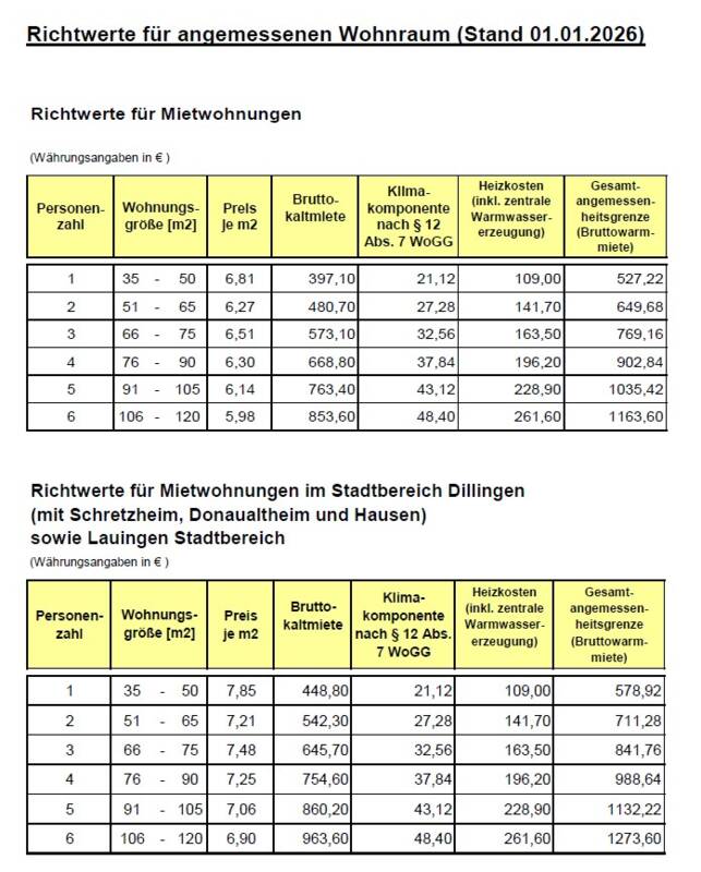 Der Landkreis Dillingen a.d.Donau hat in seiner Eigenschaft als Träger der Leistungen nach § 22 SGB II (§ 6 Abs. 1 Satz 1 Nr. 2 SGB II) Richtwerte für angemessene Kosten für Unterkunft und Heizung bestimmt. Nachfolgende Hinweise sollen eine Orientierungshilfe für den erzielbaren Mietzins darstellen:
